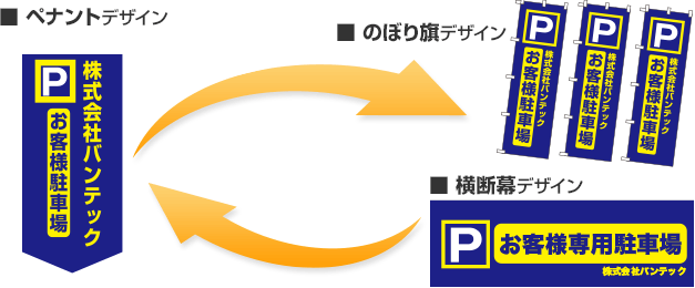 ペナント・街灯フラッグと同じデザインで、また、少しアレンジを加えて、のぼり旗や横断幕などの商品を手軽にお作りいただくことが可能です。